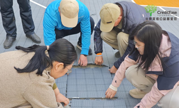 结束校园探访后,志愿者们与孩子们一起动手搭建由宜信公益基金会捐赠的篮球场。现场瞬间热闹起来,大家帮忙搬运材料,认真铺设球场地面。把一块块的塑胶地板拼接好后,还要在衔接处踩一踩,确保平整结实。在大家的共同努力协作下,很快就把篮球场拼接完整了。