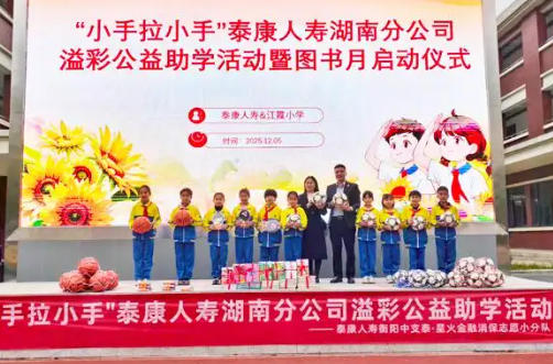 近日,泰康人寿保险有限责任公司湖南衡阳中心支公司“小手拉小手·溢彩公益助学”活动在石鼓区合江街道江霞小学温馨启幕。泰康人寿携图书、体育器材等物资走进校园,以公益力量助力学校“书香校园”建设,践行“每个童年都快乐,每个孩子都精彩”的教育愿景。