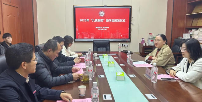 11月11日,湘潭大学2025年“九典制药助学金”颁发仪式在化学化工大楼举行。湘潭大学化学学院院长裴勇、党委书记李涛、党委副书记王果、教育基金会副主任赵家文、师生代表,与九典制药人力资源总监杨洁共同出席。此次活动不仅颁发了助学金,还通过一场富有深意的职业规划讲座,进一步深化了校企合作育人的内涵。