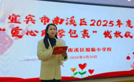冬日校园暖意融,爱心包裹点希望。2026年1月20日上午,宜宾市南溪区2025年度“爱心助学包裹”发放仪式在南溪区福临小学校温情启幕。活动由学校副校长万洁主持。