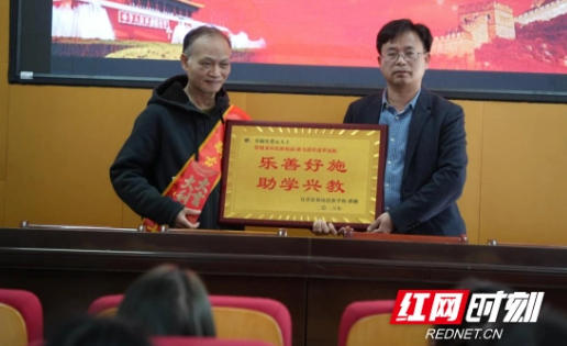 捐赠仪式上,宋嗣东将爱心款递到学校负责人手中,学校负责人向他颁发“乐善好施 助学兴教”的牌匾,现场响起热烈掌声。